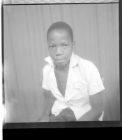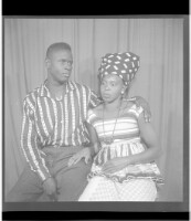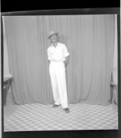 five people posing in a studio; three men, the man on the left is wearing a hat and holding a cigarette, a young woman standing in the middle with a baby sitting in front