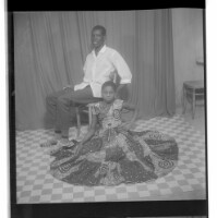 32. EAP449/2/12/32 Reference (shelfmark): EAP449/2/12/32 Title: A woman in a large dress and necklace sitting facing forward in front of a man in a shirt and pants sitting behind in profile in a chair in the studio. Collection Area: Endangered Archives Programme Languages: Not applicable Date Range: 2nd half od the 20th century Extent: 1 TIFF image