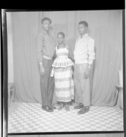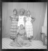 four young women posing in a studio; three are standing wearing the same white and black dress, the other is kneeling wearing a dress, all are wearing necklaces