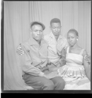 a woman and three young children are posing in a studio; the woman is sitting with a baby in her lap, she is wearing a white dress and head scarf, there is a young woman standing next to the woman and a young boy in between the girl and the woman with hi