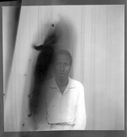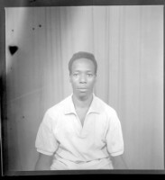 a couple posing in a studio; the young man is standing and leaning on the young woman's shoulder, he is wearing a white shirt, and the girl is wearing a white dress with straps and a white necklace and head scarf, her arms are crossed on her lap and her h