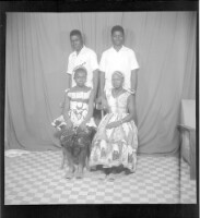three people posing at a studio; two young men standing behind two girls sitting, the young men are wearing white shirts and the girls are wearing multi-coloured dresses and decorative head scarves