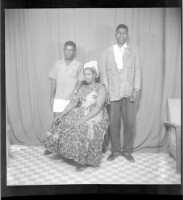 three people posing in a studio, two young men standing behind a woman sitting on a chair, the young men are wearing grey shirts one with a jacket, the woman is wearing a dress and a head scarf