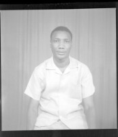 a couple posing in a studio; the man is standing wearing a grey shirt and black pants, the young woman is wearing a multi-coloured dress, necklace, head scarf and her arms are crossed