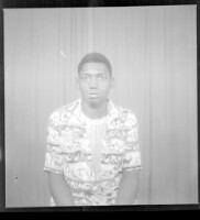 a couple posing in a studio; the man is standing wearing a white shirt and black pants, he is standing over the girl who is sitting on a chair with her arms crossed in her lap, she is wearing a white dress, necklace, earrings, bracelet (same group as 0809