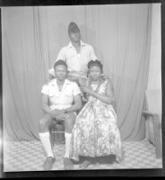 three people posing, two men in police uniforms, one is sitting and the other is standing wearing a hat, the woman is sitting with an arm on the man's shoulder, she is wearing a multi-coloured dress, necklace, earrings and has her hair styled