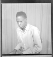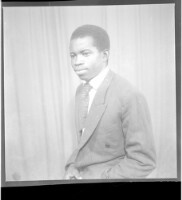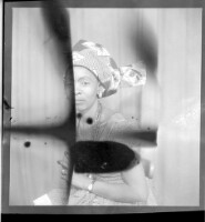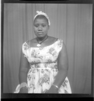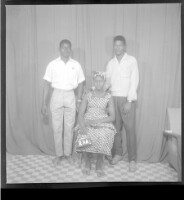 a couple posing in a studio; both are sitting, the man is wearing a white shirt and shorts, the woman is wearing a black and white dress with a headscarf