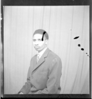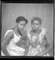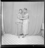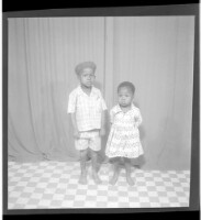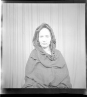 a couple posing in a studio; the man is standing wearing a white robe and a headscarf, the woman is sitting wearing a white dress with her hands crossed in her lap