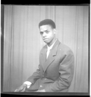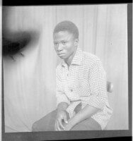 a couple posing in a studio; a man sitting wearing a white shirt with a black jacket suit with his arm around a woman wearing a white dress, earrings, necklace, black headscarf