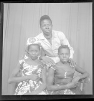 581. EAP449/2/12/581 Reference (shelfmark): EAP449/2/12/581 Title: three people posing in a studio; two girls sitting wearing patterned dresses, the boy is standing behind them wearing a white shirt Collection Area: Endangered Archives Programme Languages: Not applicable Date Range: 2nd half od the 20th century Extent: 1 TIFF image