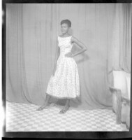 585. EAP449/2/12/585 Reference (shelfmark): EAP449/2/12/585 Title: a young woman standing posing in a studio; her hand is on her hip wearing a white dress Collection Area: Endangered Archives Programme Languages: Not applicable Date Range: 2nd half od the 20th century Extent: 1 TIFF image