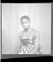589. EAP449/2/12/589 Reference (shelfmark): EAP449/2/12/589 Title: a young woman posing in a studio; sitting wearing a patterned dress, earrings, hair braided Collection Area: Endangered Archives Programme Languages: Not applicable Date Range: 2nd half od the 20th century Extent: 1 TIFF image
