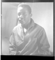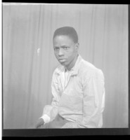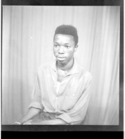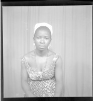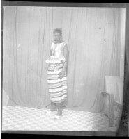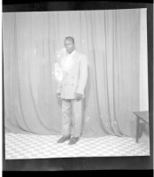 two couples posing in a studio; the two young boys one wearing a white shirt, the other a black shirt, the two young women wearing matching white dresses