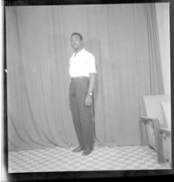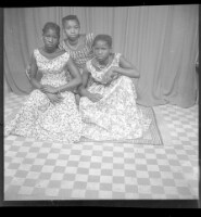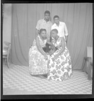 four young people posing in a studio; two young men standing wearing white shirts, they are standing behind two girls sitting in chairs wearing similar dresses