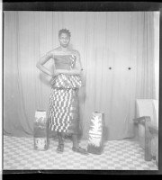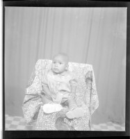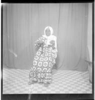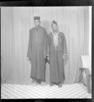 a couple posing in a studio; both are sitting holding each other, the man is wearing a white shirt with a black vest and tie, the young woman is wearing a black dress with her hair styled, necklace and headscarf