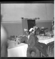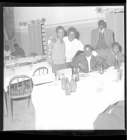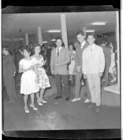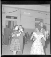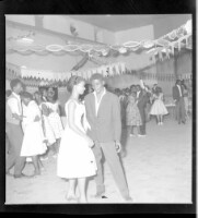 a decorated high school dance party; in the foreground a couple is dancing, the man wearing a white shirt with black pants, the young woman wearing a dress, another man wearing a black suit and the back of a man wearing a black suit