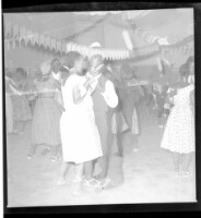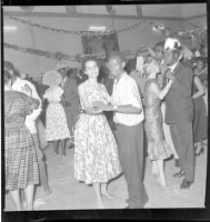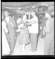 high school dance party, twelve people in the foreground, a couple dancing, the black man wearing a white shirt and black pants and a white girl wearing a dress, six other couples dancing