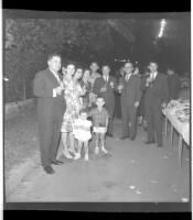 a party ; ten white people a family photo, five men and four women with two young children standing in front, the men are wearing black suits, the women are wearing dresses, all are holding a glass