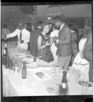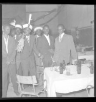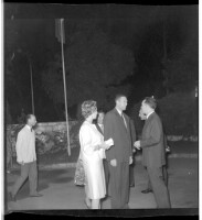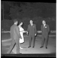 high school dance party; three men standing at an entrance wearing similar black suits, a woman standing in the middle wearing a white dress with a white handbag