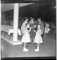a party in a courtyard; three couples dancing, all the men wearing black jacket suits, the young women are wearing dresses, in the background a young couple dancing and wearing hats