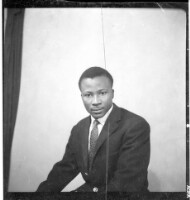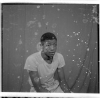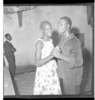 three people at a party ; a couple dancing, the young man wearing a black shirt and pants, the young woman wearing a patterned dress and hair is styled she is smiling, a man in the background has his arms crossed