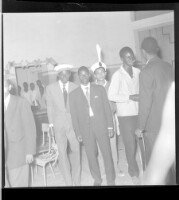 A couple standing at a party: a young woman wearing a black and white dress and a young man wearing a shirt and a black leather jacket, with three couples behind.