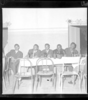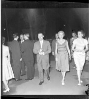 Four couples dancing in the foreground of a party: a young woman wearing a dress with her hair styled and a man smiling and wearing a black jacket, the other three couples behind, and two young men wearing black jackets with their backs facing forward.