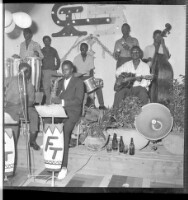 A couple in the foreground of a party: a man wearing a white shirt, black suit coat, black pants, and a feather headdress with a woman wearing a white dress and a hat, surrounded by three young woman wearing white dresses dancing.