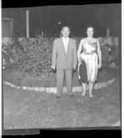 A white couple standing in a courtyard: a man wearing a white shirt and grey suit with a woman wearing a black and white dress, smiling in front of some flowers.