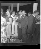 802. EAP449/2/12/802 Reference (shelfmark): EAP449/2/12/802 Title: A young woman wearing a white dress with a man wearing a white shirt, black suit coat, and hat in the foreground of a party. Collection Area: Endangered Archives Programme Languages: Not applicable Date Range: 2nd half od the 20th century Extent: 1 TIFF image