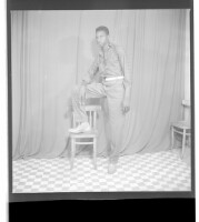 83. EAP449/2/12/83 Reference (shelfmark): EAP449/2/12/83 Title: A man in a dress shirt and pants, foot on a stool standing in profile in the studio. Collection Area: Endangered Archives Programme Languages: Not applicable Date Range: 2nd half od the 20th century Extent: 1 TIFF image