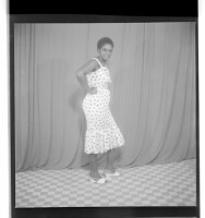 84. EAP449/2/12/84 Reference (shelfmark): EAP449/2/12/84 Title: A woman in a dress and glasses standing facing forward in the studio. Collection Area: Endangered Archives Programme Languages: Not applicable Date Range: 2nd half od the 20th century Extent: 1 TIFF image