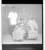 85. EAP449/2/12/85 Reference (shelfmark): EAP449/2/12/85 Title: Two women in large dresses and headscarves sitting in profile, one with a baby in the middle and a man in a dress shirt and pants standing in profile in the studio. Collection Area: Endangered Archives Programme Languages: Not applicable Date Range: 2nd half od the 20th century Extent: 1 TIFF image