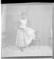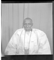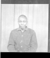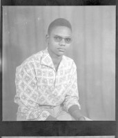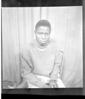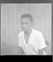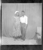 A young man wearing a white long-sleeved shirt, black pants, and a watch with a woman wearing a dress and white head-wrap, both standing face-forward in the studio.