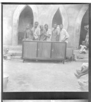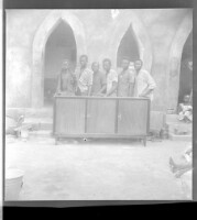 Six young men all wearing shirts behind a dresser, standing in front of a large building with three doorways, a little girl sitting on the stairs, and a woman with only her feet in the frame.
