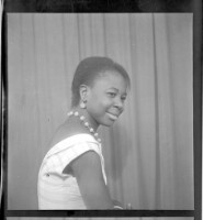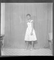 115. EAP449/2/13/115 Reference (shelfmark): EAP449/2/13/115 Title: A young woman wearing a patterned white dress, a necklace around her neck, and earrings standing face-forward in the back of the studio. Collection Area: Endangered Archives Programme Languages: Not applicable Date Range: 2nd half od the 20th century Extent: 1 TIFF image