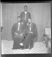 119. EAP449/2/13/119 Reference (shelfmark): EAP449/2/13/119 Title: Three men, two wearing large black boubous sitting on chairs and the other wearing a black boubou standing in the studio. Collection Area: Endangered Archives Programme Languages: Not applicable Date Range: 2nd half od the 20th century Extent: 1 TIFF image