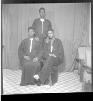 118. EAP449/2/13/118 Reference (shelfmark): EAP449/2/13/118 Title: Three men, two wearing large black boubous sitting on chairs and the other wearing a black boubou standing in the studio. Collection Area: Endangered Archives Programme Languages: Not applicable Date Range: 2nd half od the 20th century Extent: 1 TIFF image