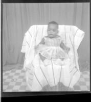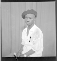 141. EAP449/2/13/141 Reference (shelfmark): EAP449/2/13/141 Title: A young boy wearing a white t-shirt, a black beret, and a watch sitting face-forward in the studio. Collection Area: Endangered Archives Programme Languages: Not applicable Date Range: 2nd half od the 20th century Extent: 1 TIFF image