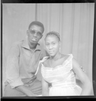 147. EAP449/2/13/147 Reference (shelfmark): EAP449/2/13/147 Title: A man wearing a black shirt and black pants with glasses sitting with a woman wearing a white dress and a necklace with her hair styled, face-forward and holding each other in the studio. Collection Area: Endangered Archives Programme Languages: Not applicable Date Range: 2nd half od the 20th century Extent: 1 TIFF image
