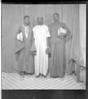 158. EAP449/2/13/158 Reference (shelfmark): EAP449/2/13/158 Title: Three men all wearing large boubous, two wearing black boubous with two helmets and the other in between wearing a white boubou and a watch, all standing in the studio. Collection Area: Endangered Archives Programme Languages: Not applicable Date Range: 2nd half od the 20th century Extent: 1 TIFF image