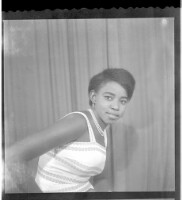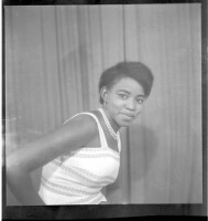 200. EAP449/2/13/200 Reference (shelfmark): EAP449/2/13/200 Title: A young woman wearing a white and black dress, a necklace, and earrings with her foot on a chair, standing face-forward in the studio. Collection Area: Endangered Archives Programme Languages: Not applicable Date Range: 2nd half od the 20th century Extent: 1 TIFF image