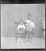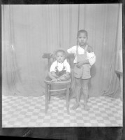 194. EAP449/2/13/194 Reference (shelfmark): EAP449/2/13/194 Title: A baby wearing all white with amulets around his neck sitting on a chair with a boy standing face-forward in the studio. Collection Area: Endangered Archives Programme Languages: Not applicable Date Range: 2nd half od the 20th century Extent: 1 TIFF image