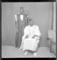 222. EAP449/2/13/222 Reference (shelfmark): EAP449/2/13/222 Title: Two men, one wearing a black boubou standing and the other wearing a white boubou sitting, both wearing black fezzes face-forward in the studio. Collection Area: Endangered Archives Programme Languages: Not applicable Date Range: 2nd half od the 20th century Extent: 1 TIFF image
