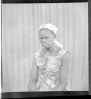 225. EAP449/2/13/225 Reference (shelfmark): EAP449/2/13/225 Title: A woman wearing a dress made of bassin, earrings, a necklace, and a head-wrap sitting in profile on a chair in the studio. Collection Area: Endangered Archives Programme Languages: Not applicable Date Range: 2nd half od the 20th century Extent: 1 TIFF image