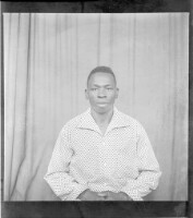 249. EAP449/2/13/249 Reference (shelfmark): EAP449/2/13/249 Title: A man wearing a black and white shirt sitting face-forward in the studio. Collection Area: Endangered Archives Programme Languages: Not applicable Date Range: 2nd half od the 20th century Extent: 1 TIFF image