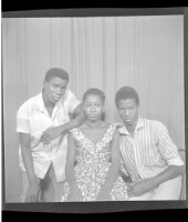 A family photo of six people: two young women wearing dresses, the one on the left wearing a head-wrap, crouching on their knees in front, three men wearing grey and black suits standing, and a girl wearing a pagne and head-wrap standing in the studio.