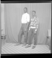 Two young men, one wearing a white shirt and black pants standing and the other wearing a white shirt, pants, and a hat sitting, both face-forward in the studio.