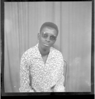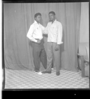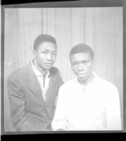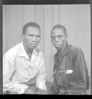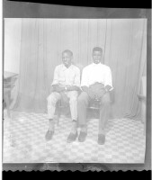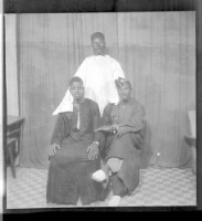 Two men wearing matching black boubous sitting and another man wearing a large white boubou, a black fez, and black pants standing, all in profile in the studio.