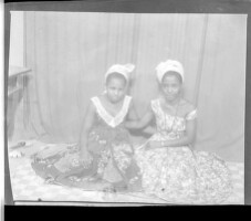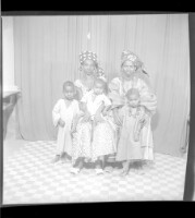 Five people, two women wearing large boubous and head-wraps sitting, a baby sitting, a boy wearing a boubou and amulets around his neck standing, and another boy wearing a boubou standing, all face-forward in the studio.